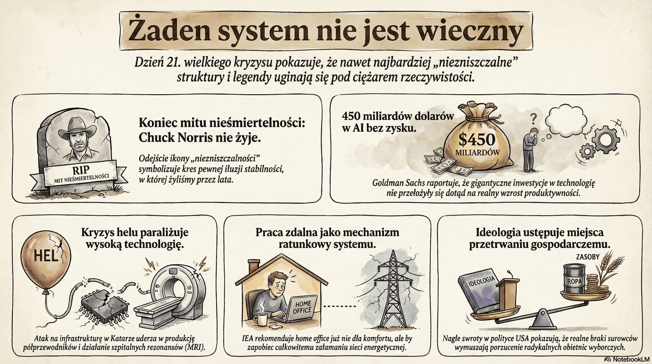 Spokojniejszy piątek po dwóch tygodniach chaosu. Katar traci kolejne elementy infrastruktury krytycznej. Goldman Sachs przyznaje: setki miliardów w AI nie przełożyły się na produktywność. International Energy Agency rekomenduje pracę zdalną, żeby ratować system energetyczny. Donald Trump wycofuje się z własnych decyzji i jednocześnie obraża sojuszników. A Chuck Norris — symbol „nieśmiertelności internetu” — odchodzi.
