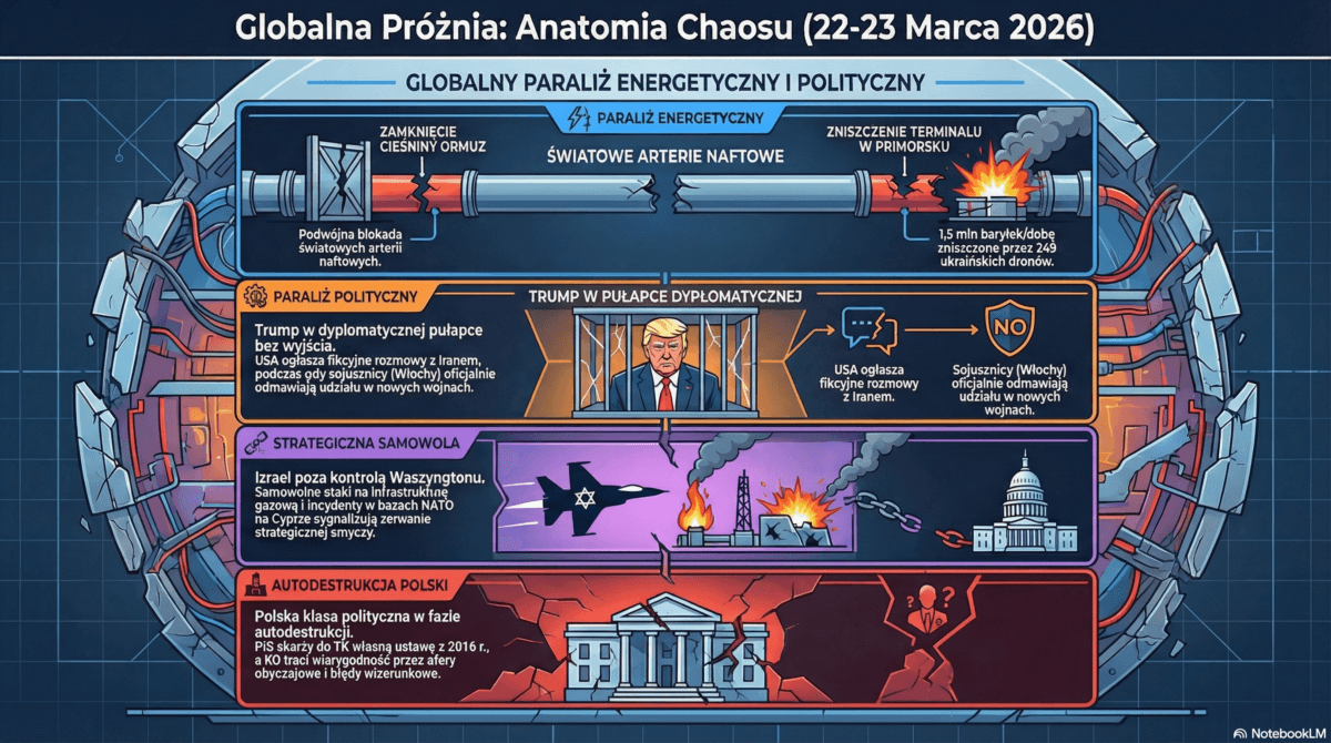 Trump negocjuje sam ze sobą i przegrywa. Ukraina gra asymetrycznie i trafia w serce rosyjskich przychodów. Izrael odrywa się od kontroli Waszyngtonu i atakuje własnych sojuszników. PiS deklaruje własną niekonstytucyjność. KO tonie w aferach stworzonych na własne życzenie. Stary system nie pada w jednym miejscu — on się rozpada jednocześnie wszędzie, tracąc kontrolę nad faktami, narracją i ostatecznie nad władzą.