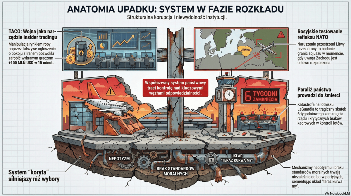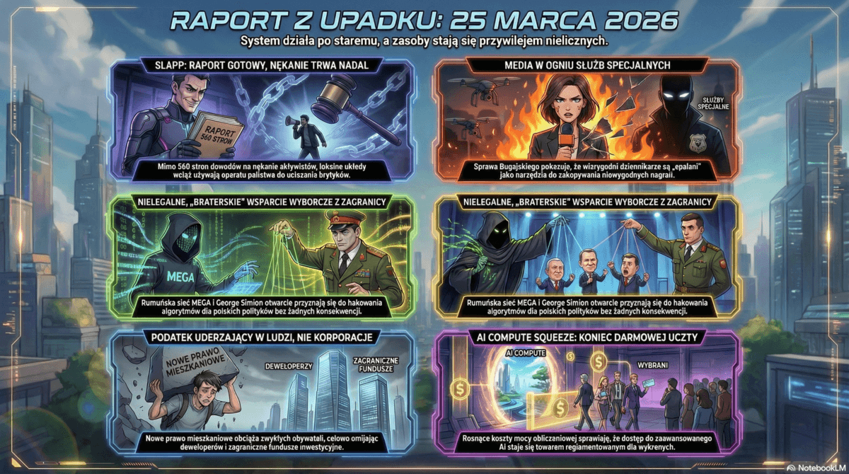 Pięć sygnałów, jedna diagnoza: systemy kontroli nie działają na żadnym poziomie. Sąd wysyła nominata ziobry do sprawy uszytej przez ludzi od ziobry. USA kradną sojusznikom i nikt ich nie ściga. Lobbyści piszą ustawy a politycy je przepuszczają. Jeden głos dzieli nas od totalnej inwigilacji. A człowiek z postępującą demencją zarządza zachodem bez żadnego hamulca.