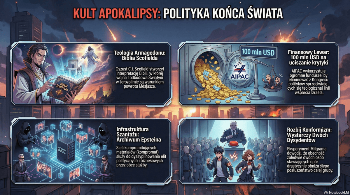 Teologię z XIX wieku (Darby–Scofield) wsparły dwie linie nacisku – oficjalna (AIPAC i setki milionów dolarów na kampanie) oraz nieoficjalna (sieć szantażu Epsteina powiązana z Mossadem).