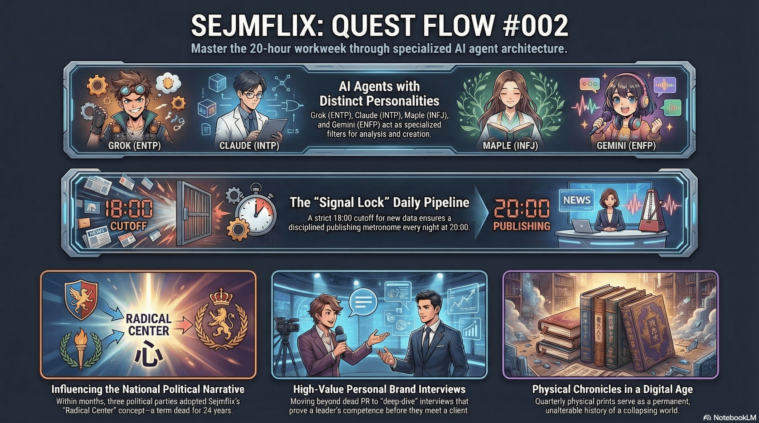 Grok jako ENTP nie zbiera tweetów — szuka dziur w argumentacji i anomalii w szumie. Claude jako INTP nie pisze artykułów — tłumaczy zależności przyczynowe. Maple jako INFJ nie poprawia języka — dba o to żeby prawda nie skończyła się w sądzie. A jeśli trafi, to żeby sprawa była do wygrania. Gemini jako ENFP nie robi grafik — produkuje formaty, które algorytm chce podbijać.