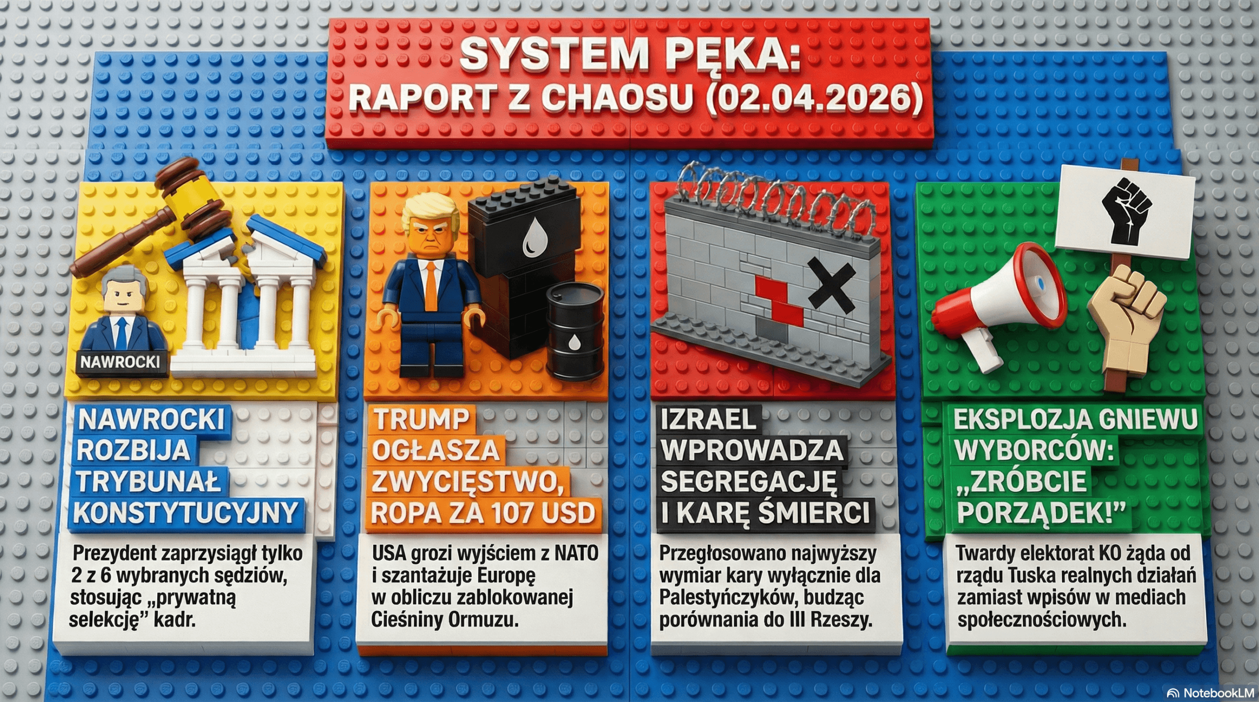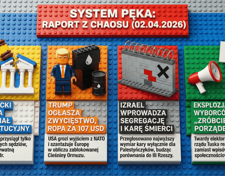 7 kwietnia 2026, godz. 20:00 polskiego czasu. Kolejne „ultimatum” Trumpa mija za kilka godzin. Irańczycy stoją przy elektrowniach. Ropa kosztuje 110 dolarów. Bloomberg ogłasza śmierć petrodolara. W Polsce — krypto-pralnia, służby bez smyczy i premier, który pisze tweety zamiast rozliczać bandytów.