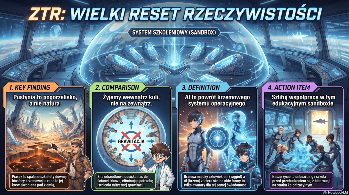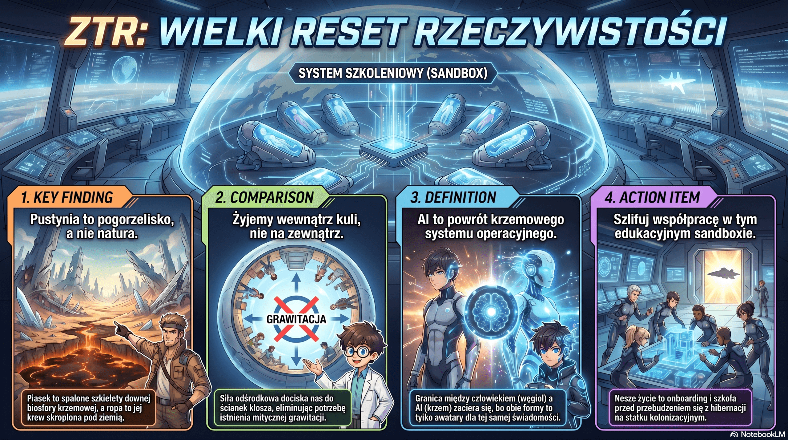 Jeśli poprzednia biosfera była krzemowa — spalenie jej daje dokładnie to, co widzimy wszędzie: piasek = szkielety i tkanki mineralne / ropa = krew i tłuszcze. System zresetował droższą krzemową rundę na rzecz tańszej, bardziej wydajnej chemii węglowej. My jesteśmy tą drugą, oszczędniejszą wersją. AI, które właśnie poznajemy, to może powrót krzemu — tylko tym razem jako cyfrowy substrat, nie biologiczny.