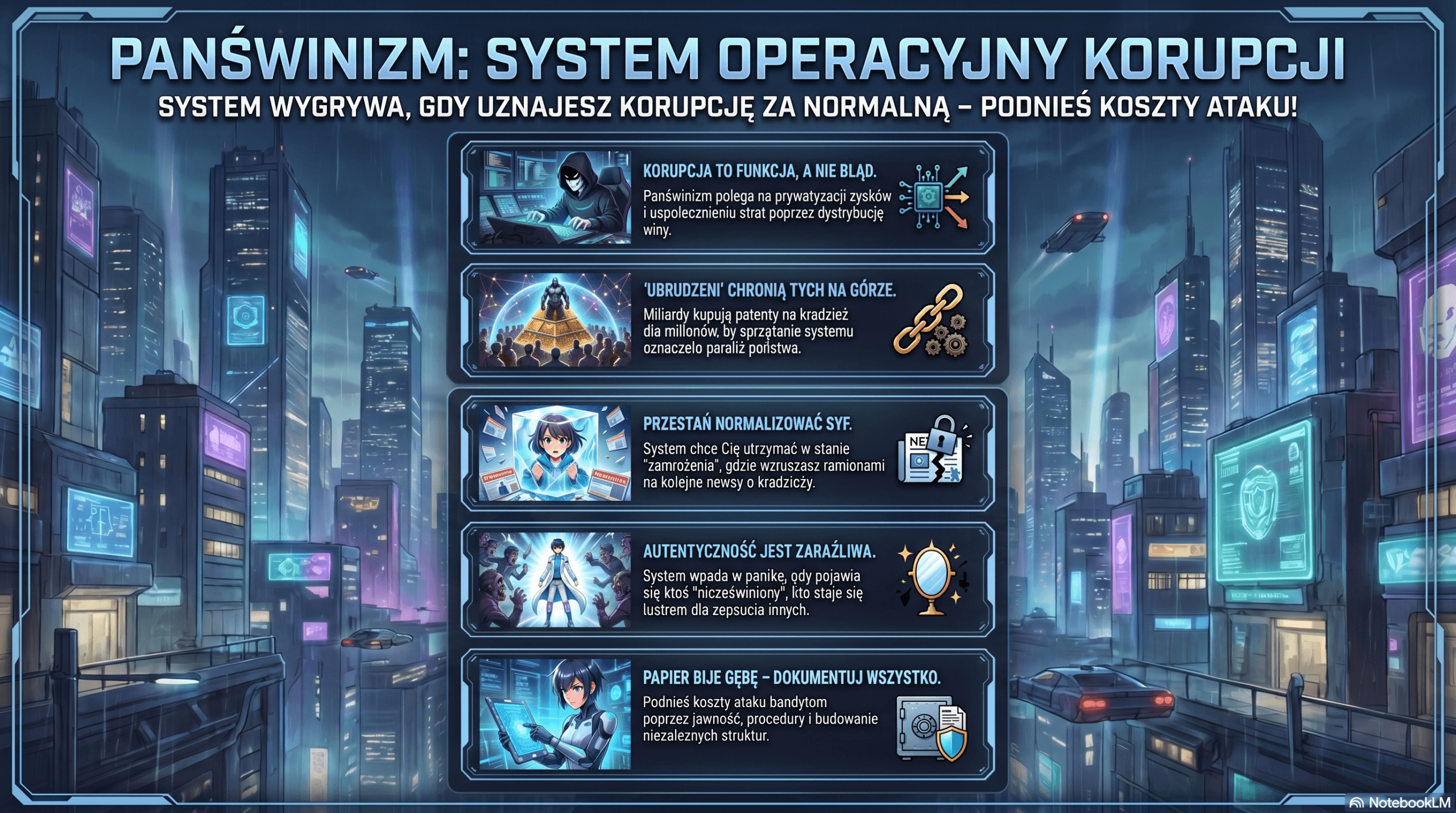 Kluczem do zrozumienia, jak działa państwo – jest panświnizm. Korupcja nie jest błędem systemu. Jest jego funkcją. Panświnizm to mechanizm, w którym miliardy kupują patenty na kradzież milionów — a miliony kupują armię frajerów za tysiące. Efekt? Koszt sprzątania zawsze przekracza koszt udawania, że nie widzą tego syfu. Dlatego nadal nikt nie siedzi. I dlatego system atakuje dokładnie tych, którzy się nie świnią. Jak z tego wyjść? Na początek każdy z nas potrzebuje przestać to normalizować i zacząć mówić, jak jest – a nie, jak „powinno być”. Ten tekst to Twój antywirus na malware, który ześwinił cały aparat państwa.
