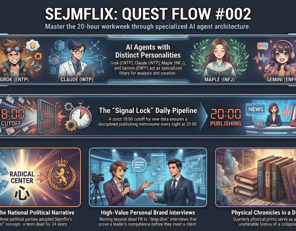 W drugim tygodniu operacyjnym Sejmflix przestał być eksperymentem. Stał się dowodem. Jeden człowiek, cztery wyspecjalizowane agenty AI, 15 opublikowanych materiałów, jeden dziesięciominutowy poślizg przez cały tydzień. […]