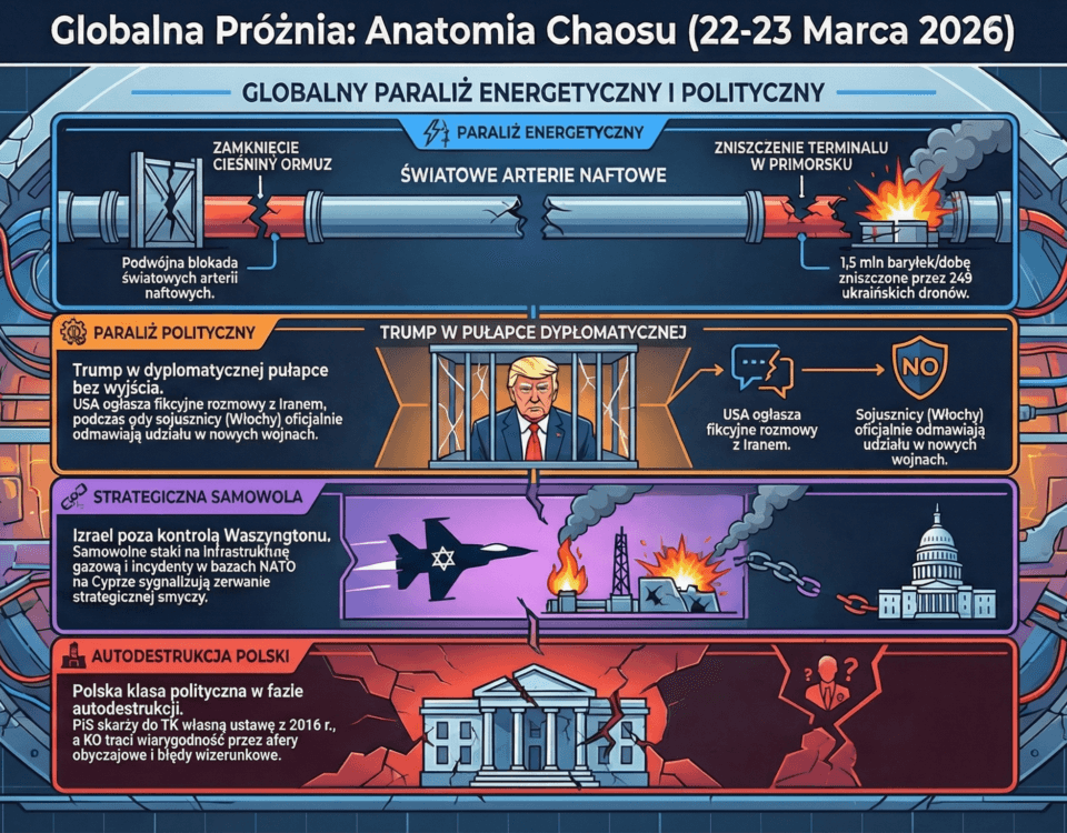 Marzec 2026 kończy się dokładnie tak jak się zaczął — eskalacją bez hamulców i rachunkiem który ktoś inny ma zapłacić. Izrael wprowadza karę śmierci wyłącznie dla […]